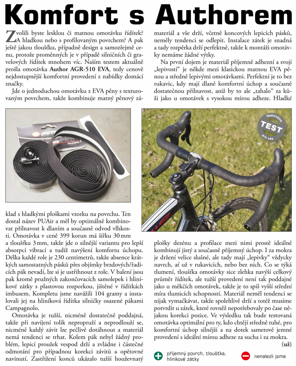 AUTHOR pěnová omotávka AGR-E510 je ideálním doplňkem pro silniční, gravelové nebo cyklokrosové kolo. Díky této pásce mají ruce pohodlnější úchop řídítek na rozbitých silnicích a v terénu včetně částečné absorpce vibrací. Speciálně navržená textura je dostatečně přilnavá za každého počasí. Je vyrobena z 3mm silné EVA pěny s PUAir povrchem. Omotávka je elastická a umožňuje dokonalé omotání ohybů řídítek.
