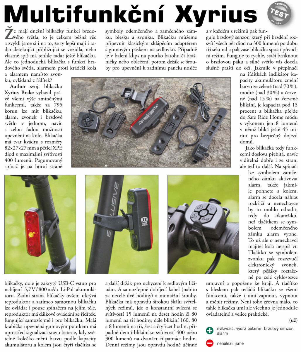 AUTHOR XYRIUS BRAKE se svítivostí až 400 lm a s brzdovým senzorem. Díky speciálnímu tvaru optického skla je jasně vidět ve dne i v noci ze širokého úhlu. S funkcí Safe Ride Home, která se automaticky aktivuje při nízké kapacitě baterie, máte 45 minut na bezpečný návrat. Vysoká svítivost XPE diod, optické sklo a brzdový sensor zaručuje vysokou viditelnost-bezpečnost v silničním provozu.